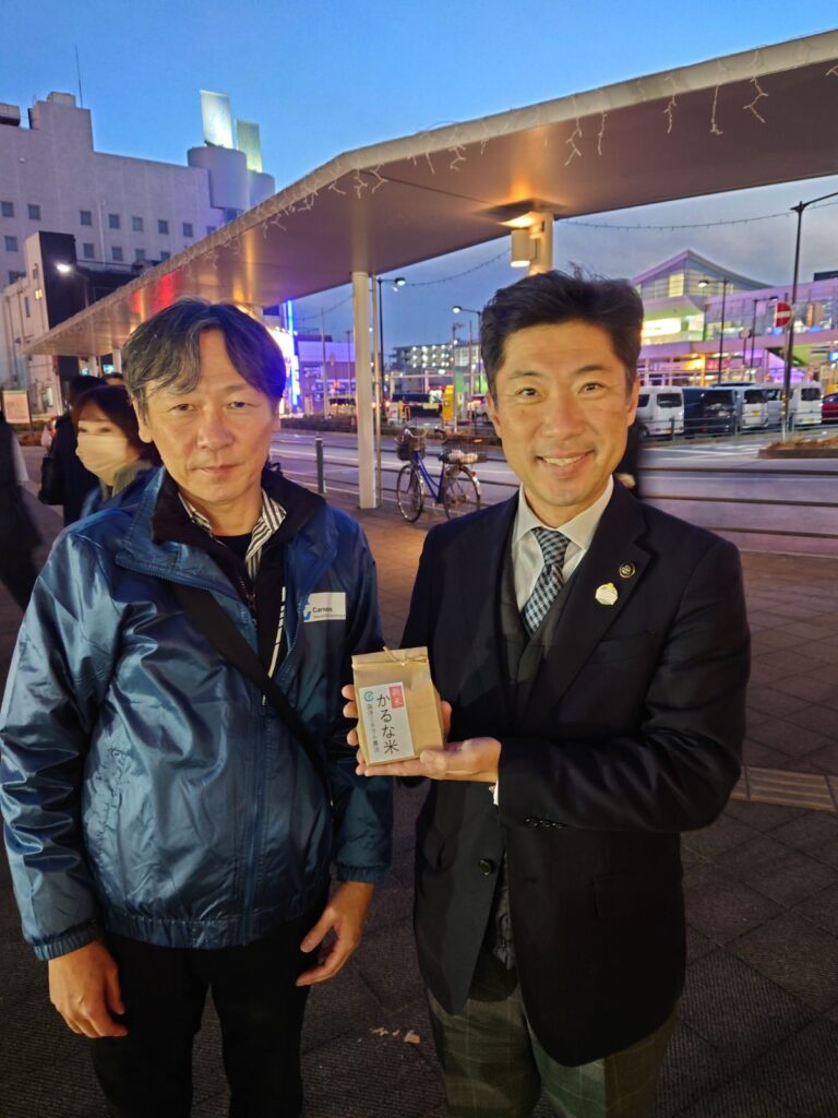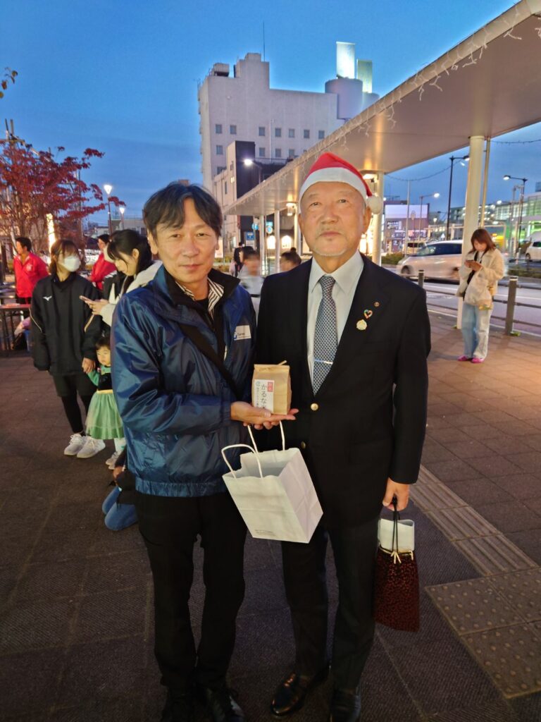 12月1日ひたちなか市駅前でおこわれました『 イルミネーション点灯式 』会場におきまして、ご来場のお客様へ当社主力商品であるCarna米の無料配布を実施させていただきました。会場当日は、たくさんのご来場様をはじめ、ひたちなか市長:大谷 明 様、ひたちなか商工会議所:柳生 修 様 にも当社ブースへお立ち寄りいただき、ひと足はやいChristmasプレゼント、Carna米をお渡しすることができました。来年、2026年度は地元、ひたちなか市の素材に拘ったお米を増産して参りますので皆さまご期待ください。